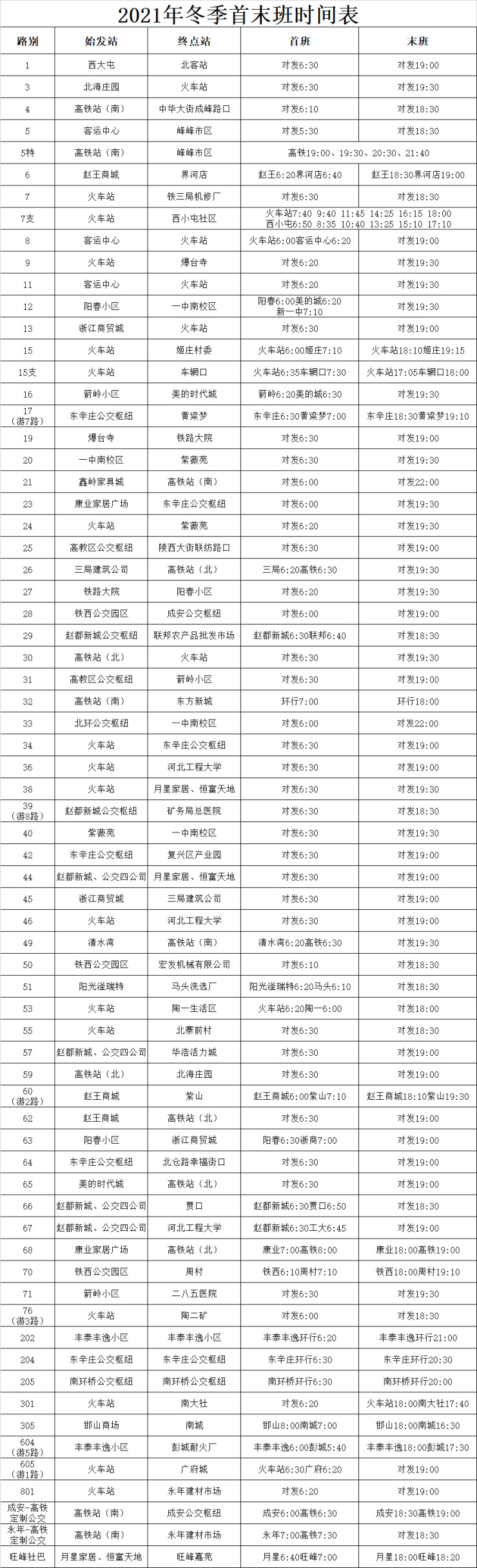 从邯郸市公交集团获悉,自10月10日起,邯郸市公交执行冬季运营时间,首班车发车时间不变,末班车在夏季发车时间的基础上提前30分钟,个别线路视客流情况进行调整。具体如下: