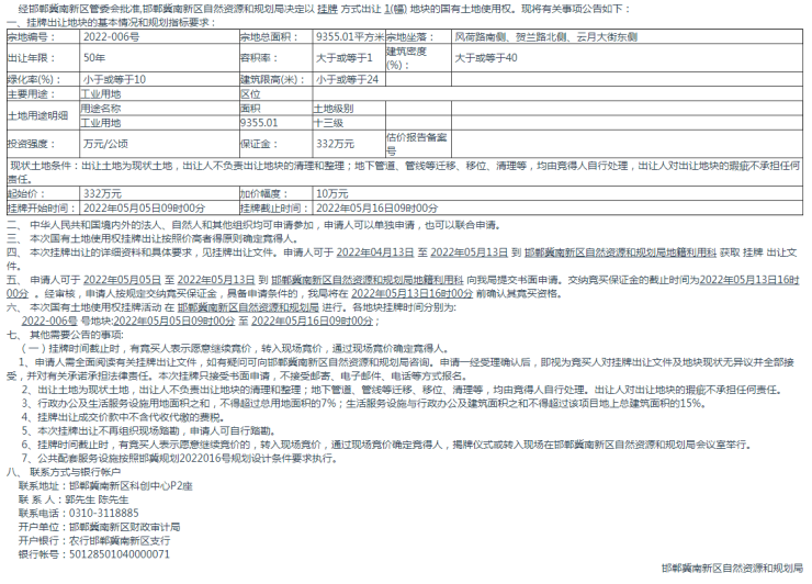 邯郸冀南新区自然资源和规划局国有土地使用权挂牌出让公告(冀南新区自然资源告字[2022]4号)